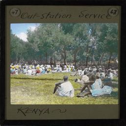 | Keywords: Out-Station Service, Kenya, ca.1905-ca.1940 (imp-cswc-GB-237-CSWC47-LS7-047).jpg en <br> Out-Station Service Kenya ca 1905-ca 1940 Out-station Service Photograph of a large group gathered for an out-station service at one of the mission hospitals in Kenya The group is gathered sitting on the ground in an opening surrounded by trees ; This belongs to a series of Church of Scotland Foreign Missions Committee lantern slides relating to the Kikuyu Mission in Kenya which was set up by Church of Scotland missionaries Hospitals were established by Scottish missionaries in Kikuyu in 1908 in Tumutumu in 1909 and in Chogoria in 1922 The missionaries also introduced the Presbyterian Church to the area The Kikuyu are Kenyaas most populous ethnic group Photographer Unknown Filename imp-cswc-GB-237-CSWC47-LS7-047 tif Coverage date 1905/1940 Part of collection International Mission Photography Archive ca 1860-ca 1960 Type images Part of subcollection Photographs from the Centre for the Study of World Christianity University of Edinburgh U K ca 1900-ca 1940s Repository name Centre for the Study of World Christianity Archival file impaunpub_Volume7/1653 url Repository address The University of Edinburgh School of Divinity New College Mound Place Edinburgh EH1 2LX United Kingdom Geographic subject country Kenya Format aacr2 1 lantern slide 8 x 8 cm Geographic subject continent Africa Rights Contact the repository for details Part of series Kenya Mission LS7 Repository email divinity-CSWC ed ac uk Subject lcsh Keyword Medical care; Hospital patients Date created 1905/1940 Publisher of the digital version University of Southern California Libraries Subject aat genre exterior views Format aat lantern slides Legacy record ID impa-m68760 Access conditions http //www ed ac uk/schools-departments/divinity/research/centres/world-christianity/collections-resources File GB 237 CSWC47/LS7/47 1905/1940 author http //digitallibrary usc edu/cdm/ref/collection/p15799coll123/id/64773 PD-old-70-1923 Magic lantern images Images from USC Digital Library uploaded by Fæ International Mission Photography Archive ca 1860-ca 1960 |