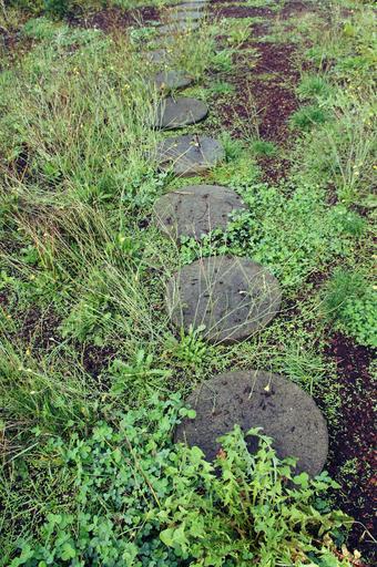 Keywords: outdoor garden pathway stepping stones concrete cement round circles nature outside outdoors grass weeds steps gardening garden pathway stone green park walkway path natural way walk backyard landscape footpath clover