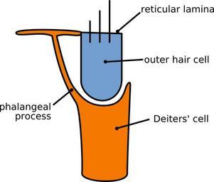 | Keywords: Outer hair cell and Deiter's cell.svg en A diagram showing the outer hair cell with the supporting Deiters' cell Deiters' cell has a phalangeal process which extends up meeting the top of the hair cell The reticular lamina is the surface formed by the apical surfaces of the inner hair cells the pillar cells the apical outer hair cells and the phalangeal process of Deiters' cells own Inductiveload 2009-02-15 SVG files on Organ of Corti Sensory Neuroscience Hearing and speech | ||||