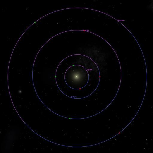 Keywords: Outer Planet Orbits.jpg en wikipedia 2009 April 13 This image shows the orbits nodes and perihelion/aphelion positions of the outer planets Seen from the northern ecliptic pole The planets run counterclockwise The blue part of an orbit is north of the ecliptic plane the pink part south Green dot perihelion; red dot aphelion Cette image montre les orbites les noeuds et la position des périhélies et aphélies des planètes les plus extérieures de notre système solaire vu du pôle de l'écliptique nord Les planetes orbitent dans le sens inverse des aiguilles d'une montre sens trigonometrique La partie bleue des orbites est au nord du plan de l'écliptique terrestre la partie rose au sud Point vert périhélie; point rouge aphélie Diese Abbildung zeigt die Bahnen Knoten und Lage der Perihelien und Aphelien der äußeren Planeten gesehen vom nördlichen Ekliptikpol Die Planeten laufen gegen den Uhrzeigersinn Der blaue Teil einer Bahn liegt nördlich der Ekliptikebene der violette südlich Grüner Punkt Perihel; roter Punkt Aphel own original text I created this work entirely by myself 1 13/10/08 Danial79 talk Danial79 Original upload log en wikipedia Kyro CommonsHelper page en wikipedia Outer_Planet_Orbits jpg 2008-10-13 04 31 Danial79 1000×1000× 201632 bytes <nowiki>This image shows the orbits of the 4 outer planets The nodes are shown as small white lines with the orbital segment below the ecliptic shown in purple and above as blue The perihelion is shown as a green circle and the aphelion as a red circle The nam</nowiki> Astronomical diagrams Solar System |