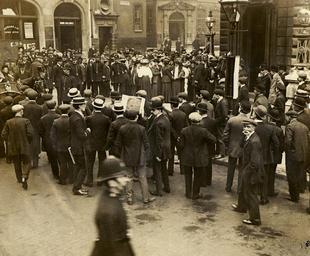 | Keywords: the women's library thewomenslibrary women suffrage politics hires monochrome people crowd 7JCC/O/02/052 Photograph, printed, paper, monochrome, a crowd of men and women with large numbers of policemen outside the door of Bow Street Magistrates' Court; manuscript inscription on reverse 'Bow Street. Crowd waiting for Mrs Pankhurst', printed 'World's Graphic Press' 7JCC/O/02/052 Photograph, printed, paper, monochrome, a crowd of men and women with large numbers of policemen outside the door of Bow Street Magistrates' Court; manuscript inscription on reverse 'Bow Street. Crowd waiting for Mrs Pankhurst', printed 'World's Graphic Press' |