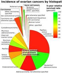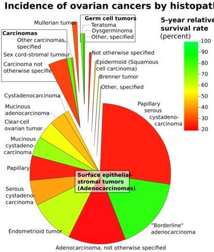 | Keywords: Ovarian cancers by histopathology.svg Classification of ovarian cancers in women aged 20+ with area representing histopathological type and colors representing 5-year relative survival rate Cite book Chapter 16 Cancers of the Ovary Carol L Kosary 133 “144 National Cancer Institute SEER Survival Monograph Cancer Survival Among Adults US SEER Program 1988-2001 Patient and Tumor Characteristics Baguio RNL Young JL Keel GE Eisner MP Lin YD Horner M-J SEER Program NIH Pub No 07-6215 Bethesda MD 2007 http //seer cancer gov/publications/survival/surv_ovary pdf http //seer cancer gov/publications/survival/ Mikael Häggström 2012-07-20 thumb left png-format Cc-zero Ovarian cancer |