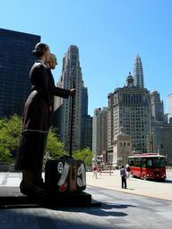 Keywords: over dimensional statues figures woman man chicago illinois usa place red bus transportation human person city buildings farmer old fashioned