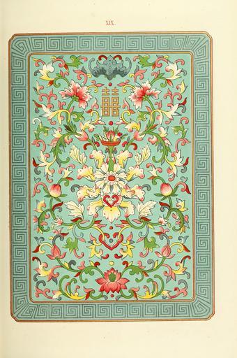 | Keywords: Owen Jones - Examples of Chinese Ornament - 1867 - plate 019.png 018 XIX 19 020 From a china Dish the pattern being stamped or engraved on the clay before colouring This is a specimen of a style of ornament of which there are to be found immense varieties It is probably much more modern than the specimens already described We have still the instinct of triangular composition but it is not so decidedly marked; the centre flower occupies more relative space and the stems out of which the flowers spring instead of flowing onwards in a series of volutes often re-enter and return upon themselves This principle is essentially Chinese whilst the flowing line is common to the Arabian Moresque Persian and Indian styles The border on the edge of the dish is almost Greek PD-old-100-1923 Floral designs in China Porcelain designs Greek key |