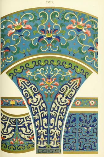 | Keywords: Owen Jones - Examples of Chinese Ornament - 1867 - plate 034.png 033 XXXIV 34 035 From a similar Vase but of the round form The upper portion of the plate is from the inside of the lip PD-old-100-1923 Cloisonné of China Floral designs in China Floral patterns Vases of China |
