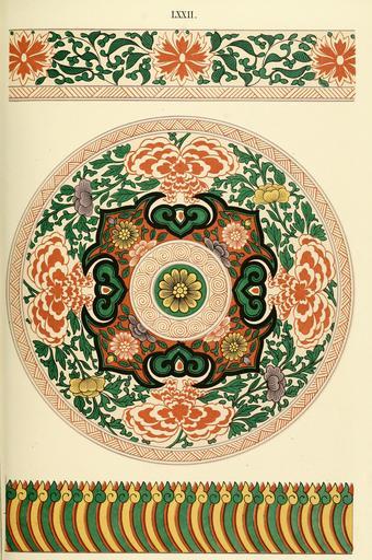 Keywords: Owen Jones - Examples of Chinese Ornament - 1867 - plate 072.png 071 LXXII 72 073 Portions of the painted china Jar described on the last plate; the ornament in the centre of the plate is from the lid of the jar PD-old-100-1923 Porcelain of China Ceramic jars Floral designs in China Floral patterns |