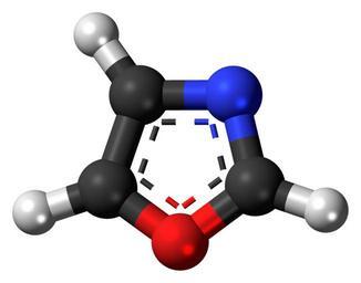 | Keywords: Oxazole-3D-balls.png Ball-and-stick model of the oxazole molecule a nitrogen-oxygen heterocycle and a simple aromatic ring Colour code 505050 Carbon C black<br> F0F0F0 Hydrogen H white<br> F51E1E Oxygen O red<br> 3C50FA Nitrogen N blue<br> 2011-02-12 own DS Visualizer Jynto talk Space-filling version cc-zero Oxazole Images by Jynto |