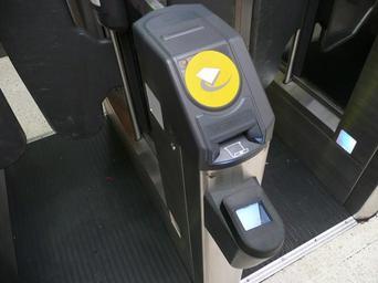 Keywords: Oyster E-Day ticket reader.jpg Oyster Card/E-Day ticket reader at Marylebone station own Oyster card readers Interior of Marylebone station Ticket barriers in London