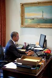 | Keywords: P100810PS-0062.jpg en President Barack Obama does last-minute edits on his remarks at the desk of Personal Secretary Katie Johnson in the Outer Oval Office Oct 8 2010 Official White House Photo by Pete Souza http //www flickr com/photos/whitehouse/5098342319/ Pete Souza White House Photographer 2010-10-08 PD-USGov Flickr-no known copyright restrictions The White House http //flickr com/photos/35591378 N03/5098342319 04 15 14 November 2010 UTC United States Government Work Barack Obama in 2010 20101008 White House in 2010 People using computers in the 2010s Photographs by Pete Souza White House presidential secretary office Barack Obama preparing for speeches Personality rights |