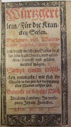 | Keywords: P16-1238 Medpro Würzgärtlein für die kranken Seelen.jpg de Würzgärtlein für die kranken Seelen Darinnen viel wohlriechende heilsame Kräuter zu finden durch welche die Seelen in allen ihren Krankheiten und Gebrechen erquickt und gelabet werden mögen Samt einem tröstlichen Unterricht wie sich ein Mensch in der Zeit der Verfolgung oder Marter trösten soll Gedruckt zu Leipzig durch Abraham Lamberg in Vorlegung Johannes Francken anno MDXC https //www flickr com/photos/mediathequeprotestante/6382383341/ P16-1238 1590 https //www flickr com/people/66690468 N02 Medpro PD-old-100 Leoboudv 2016-11-28 Images from Médiathèque protestante de Strasbourg 1590 books single pages |