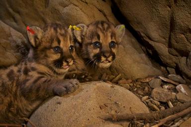 | Keywords: 5kd mountainlion p50 p51 p52 p39 National Park Service researchers discovered two litters of mountain lion kittens in the eastern Santa Susana Mountains in June 2016. A total of five kittens, three females and two males, were eartagged and returned to their respective dens earlier this month. P-50 (male), P-51 (female), and P-52 (male) were born to P-39. P-52 is on the left and P-50 is on the right. P-38 is suspected to be the father. National Park Service researchers discovered two litters of mountain lion kittens in the eastern Santa Susana Mountains in June 2016. A total of five kittens, three females and two males, were eartagged and returned to their respective dens earlier this month. P-50 (male), P-51 (female), and P-52 (male) were born to P-39. P-52 is on the left and P-50 is on the right. P-38 is suspected to be the father. |