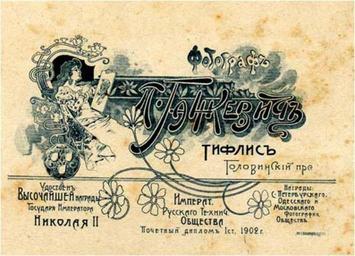 | Keywords: P. Gankevich's photographic stamp. Tiflis. 1902.jpg en P Gankevich's photographic stamp Tiflis 1902 ka პეტრე გა კევიჩის ფ ტ სტუდიის შტამპი ტფილისი 1902 წ http //www photomuseum org ge/photographers/gankevich/02 jpg www photomuseum org ge Pyotr Gankevich 1879-1931 1902 Source http //www photomuseum org ge/photographers/gankevich/gankevich_en htm www photomuseum org ge en <br> http //www photomuseum org ge/photographers/gankevich/gankevich_ge htm www photomuseum org ge ge PD-old Photos by Pyotr Gankevich 1902 in Tbilisi Photographic stamps in Georgia |