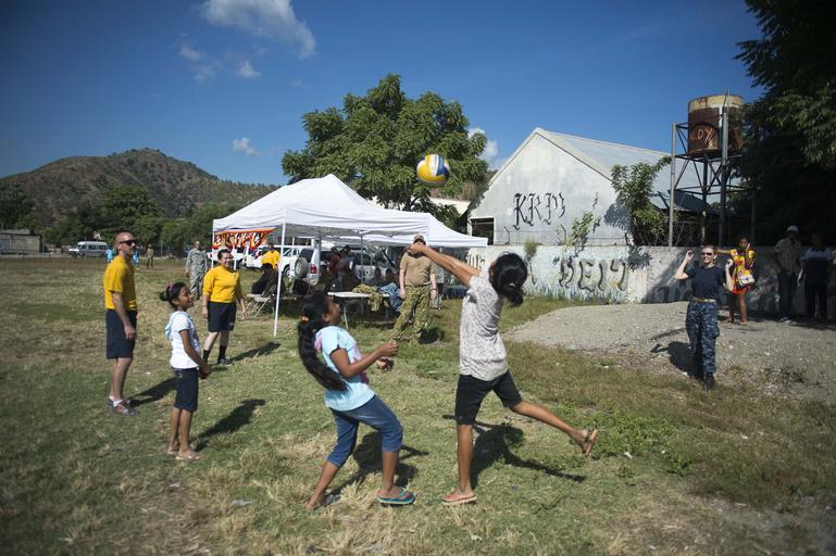 | Keywords: Pacific Partnership 2014 140614-N-IL267-029.jpg en U S Navy Lt Cmdr Shelly Benfield a public health nurse from Albert Lea Minn assigned to Naval Hospital Guam serves a soccer ball for an impromptu volleyball game with local children and other service members from the U S Australia and New Zealand during a community outreach event at Comoro Soccer Field as part of Pacific Partnership 2014 Pacific Partnership is in its ninth iteration and is the largest annual multilateral humanitarian assistance and disaster relief preparedness mission conducted in the Asia-Pacific region U S Navy photo by Mass Communication Specialist 1st Class Dustin Q Diaz/Released 2014-06-14 Petty Officer 1st Class Dustin Diaz https //www dvidshub net/image/1400648 140614-N-IL267-029 2014-06-16 11 17 DILI TL PD-USGov-Military-Navy Pacific Partnership 2014 Images from DoD uploaded by Fæ |