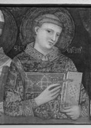 | Keywords: Pacino di Bonaguida - Madonna and Child with Saints - Walters 372494 - Detail B.jpg For more information on this dossal altarpiece please see Zeri catalogue number 3 pp 6-7 between 1323 1327 Medieval tempera on wood silver fir Painted surface H at left and right sides 18 7/8 x W 62 11/16 x D 11/16 in 47 9 x 159 2 x 1 8 cm ; Painted surface H at central gable cm 62 2 accession number 37 2494 16467 Private collection Ireland Justice James A Murnaghan Dublin ca 1930 Dr Francis Murnaghan Fund 1973 mode of acquisition unknown Walters Art Museum Gift of the Dr Francis D Murnaghan Fund 1973 Transcription The name of each saint left to right S NCOLAUS; S LAURETI; S IACOP; S FRCISC God's Minstrel St Francis of Assisi The Walters Art Gallery Baltimore 1982 Illuminated Manuscripts Masterpieces in Miniature The Walters Art Gallery Baltimore 1984-1985 place of origin Florence Italy Walters Art Museum license 2D Medieval art in the Walters Art Museum Pacino Di Bonaguida Paintings in the Walters Art Museum Media contributed by the Walters Art Museum needs category review |