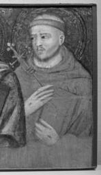 | Keywords: Pacino di Bonaguida - Madonna and Child with Saints - Walters 372494 - Detail D.jpg For more information on this dossal altarpiece please see Zeri catalogue number 3 pp 6-7 between 1323 1327 Medieval tempera on wood silver fir Painted surface H at left and right sides 18 7/8 x W 62 11/16 x D 11/16 in 47 9 x 159 2 x 1 8 cm ; Painted surface H at central gable cm 62 2 accession number 37 2494 16467 Private collection Ireland Justice James A Murnaghan Dublin ca 1930 Dr Francis Murnaghan Fund 1973 mode of acquisition unknown Walters Art Museum Gift of the Dr Francis D Murnaghan Fund 1973 Transcription The name of each saint left to right S NCOLAUS; S LAURETI; S IACOP; S FRCISC God's Minstrel St Francis of Assisi The Walters Art Gallery Baltimore 1982 Illuminated Manuscripts Masterpieces in Miniature The Walters Art Gallery Baltimore 1984-1985 place of origin Florence Italy Walters Art Museum license 2D Medieval art in the Walters Art Museum Pacino Di Bonaguida Paintings in the Walters Art Museum Media contributed by the Walters Art Museum needs category review |