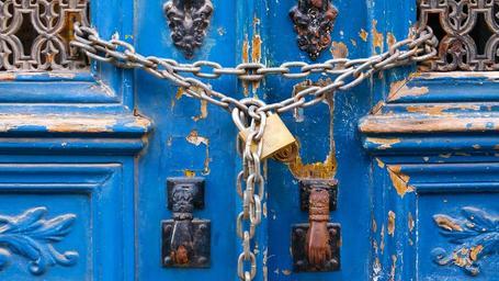 Keywords: padlock blue dies lock old worn wood chain opening gate historic destroyed