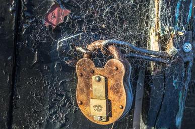 Keywords: padlock gate locked private close-up rusty cobweb iron old secret