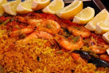 Keywords: paella rice scampi lemons spain national dish eat shrimp food seafood frisch mediterranean cuisine