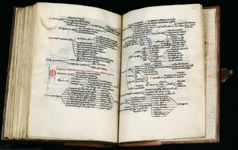 Keywords: Page of tabular summaries in "Articella.".JPG en Image of two facing pages of Distinctiones diagrammatic commentaries by Magister Ricardus on the Aphorisms Expliciunt and Prognostics Incipiunt of Hippocrates Isagoge fols 110 b-111a The image shows a sutured tear on the upper left hand side 2013-09-27 10 48 48 Courtesy of the National Library of Medicine Images from the History of Medicine IHM http //ihm nlm nih gov/images/A027357 Also showcased in the book Hidden Treasure New York NY Blast Books 2012 pp 24-25 HMD call number MS E 78 Galen Ars medica Custom license marker 2013 09 27 PD-USGov Uploaded with UploadWizard Incunabula Medicine Manuscripts Aphorisms |