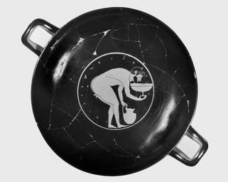 Keywords: Paidikos - Kylix Depicting Men Bending Drinking from Kylix - Walters 482240 - Interior.jpg This red-figure kylix depicts a wreathed symposiast in the tondo He bends over to the right looking into a cup which he holds delicately by the foot in his right hand; the end of his beard disappears into the vessel In the left he holds an oinochoe which rests on the ground The pose of the figure is innovative and although komasts are frequently depicted in the tondo of archaic Attic red-figure cups none share this pose This is the only vase signed by Paidikos as painter ca 510 BC early Classical terracotta with handles cm 7 5 25 3 h x diam ; at mouth cm 19 4 diam ; at foot cm 7 8 diam accession number 48 2240 16250 Hesperia Art George Allen Philadelphia date and mode of acquisition unknown Walters Art Museum 1963 by purchase Museum purchase with funds provided by the S and A P Fund 1963 Translation Paidikos painted this place of origin Attica Greece Walters Art Museum license Ancient Greek red-figure pottery in the Walters Art Museum Paidikos Media contributed by the Walters Art Museum needs category review Symposium scenes in ancient Greek pottery Komos scenes
