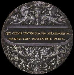 | Keywords: Painted Lid of Portrait Miniature of Philipp Melanchthon, by Hans Holbein the Younger.jpg 9 cm diameter Lower Saxony State Museum Hanover thumb 75px Holbein painted this ornamental lid for his small roundel portrait of the theologian Philipp Melanchthon right The inscription translates You who view the features of Melanchthon as if they were almost alive Holbein created them with the utmost skill Reference Stephanie Buck Hans Holbein Cologne Könemann 1999 ISBN 3829025831 p 71 Susan Foister Holbein in England London Tate 2006 ISBN 1854376454 Creator Hans Holbein d J c 1535 PD-old-100 Reverses of paintings Philipp Melanchthon by Hans Holbein der Jüngere miniature lid |