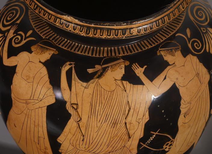 Keywords: Painter of the Florence Stamnoi - Red-figure Stamnos with Eos and Two Youths - Walters 482034 - Detail A.jpg His lyre tumbling to the ground the youth Cephalus flees the amorous goddess Eos She grabs his neck while fingering her mantle in the traditional gesture of a demure bride This theme was a popular subject for red-figure vessels from the early to mid 5th century BC This stamnos wine container belongs to a class of vessels which has a low foot in the form of a ring There are seven known stamnoi of this type All have the same size and proportions and were probably fashioned by the same potter between 470 460 BC Classical terracotta cm 36 3 19 3 accession number 48 2034 35108 Robert Garrett Collection date and mode of acquisition unknown Walters Art Museum 1951 by purchase Museum purchase 1951 Translation KALOS Pandora's Box Women in Classical Greece The Walters Art Gallery Baltimore; Dallas Museum of Art Dallas; Antikenmuseum Basel und Sammlung Ludwig Basel 1995-1996 Déjà Vu Recurrence The Walters Art Museum Baltimore 2007-2008 Heroes Mortals and Myths in Ancient Greece The Walters Art Museum Baltimore; Frist Center for the Visual Arts Nashville; San Diego Museum Of Art San Diego; Alexander S Onassis Public Benefit Foundation USA New York 2009-2011 place of origin Athens Greece Walters Art Museum license Ancient Greek red-figure pottery in the Walters Art Museum Painter of the Florence Stamnoi Media contributed by the Walters Art Museum needs category review Kalos inscriptions Eos in ancient Greek pottery |