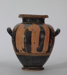 | Keywords: Painter of the Florence Stamnoi - Red-figure Stamnos with Eos and Two Youths - Walters 482034 - Side B.jpg His lyre tumbling to the ground the youth Cephalus flees the amorous goddess Eos She grabs his neck while fingering her mantle in the traditional gesture of a demure bride This theme was a popular subject for red-figure vessels from the early to mid 5th century BC This stamnos wine container belongs to a class of vessels which has a low foot in the form of a ring There are seven known stamnoi of this type All have the same size and proportions and were probably fashioned by the same potter between 470 460 BC Classical terracotta cm 36 3 19 3 accession number 48 2034 35108 Robert Garrett Collection date and mode of acquisition unknown Walters Art Museum 1951 by purchase Museum purchase 1951 Translation KALOS Pandora's Box Women in Classical Greece The Walters Art Gallery Baltimore; Dallas Museum of Art Dallas; Antikenmuseum Basel und Sammlung Ludwig Basel 1995-1996 Déjà Vu Recurrence The Walters Art Museum Baltimore 2007-2008 Heroes Mortals and Myths in Ancient Greece The Walters Art Museum Baltimore; Frist Center for the Visual Arts Nashville; San Diego Museum Of Art San Diego; Alexander S Onassis Public Benefit Foundation USA New York 2009-2011 place of origin Athens Greece Walters Art Museum license Ancient Greek red-figure pottery in the Walters Art Museum Painter of the Florence Stamnoi Media contributed by the Walters Art Museum needs category review Eos in ancient Greek pottery |