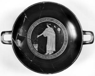 | Keywords: Painter of London D 12 - Kylix with Woman and Music Lesson - Walters 4893 - Interior.jpg This red-figure kylix depicts a woman standing to the left in the tondo She extends her right hand in which she holds a length of a wool that comes out of a kalathos on the ground before her Behind on the upper right hangs a mirror She wears a chiton mantle and fillet On the front side are three youths in a music lesson On the left a youth sits to the right on a diphros holding a barbiton upright on his lap with his left hand and a plectron in the right which is attached to the instrument by a string A bag hangs behind him An older youth in the center sits frontally on a diphros head to the left In his outstretched right hand he has a staff and in the left he holds a bag on his lap Between them hangs a pair of sandals one in profile the other shown from the bottom On the right another youth stands to the left holding out a lyre in his right hand; a plectron hangs from a string attached to the lyre All three wear a mantle and fillet On the back three youths are again depicted in a music lesson On the left a youth playing auloi sits on a diphros in profile to the right A pair of sandals hangs behind him as on the front In the center another youth stands in profile to the left A flute case and a bag hang between them On the right a third youth stands to the left holding out a lyre in his right hand; a plectron hangs from a string attached to it All three wear mantle and fillet ca 470 460 BC Classical terracotta H with handles 3 7/8 x Diam with handles 12 1/2 in 9 9 x 31 7 cm ; Diam at mouth cm 24 3 ; Diam at foot cm 9 7 accession number 48 93 19953 Don Marcello Massarenti Collection Rome 1897 cat no 241 Henry Walters city Baltimore Walters Art Museum Henry Walters Acquired by Henry Walters with the Massarenti Collection 1902 inscription place of origin Attica Greece Walters Art Museum license Ancient Greek red-figure pottery in the Walters Art Museum Painter of London D 12 Media contributed by the Walters Art Museum needs category review Media contributed by the Walters Art Museum needs artist update Kylixes Women in ancient Greek pottery Music lessons in art |