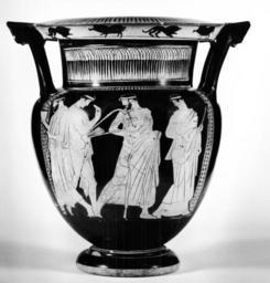 | Keywords: Painter of Munich 2335 - Column-Krater with a Komos and Three Maenads - Walters 4868 - Side A.jpg This red-figure column-krater depicts a komos On the front are three males and a woman On the left a bearded mantled man moves left looking at a skyphos less handles which he holds up in his right hand; a staff is in the left He wears a thick fillet in reserve around his head Part of the front of the figure and skyphos extend into and beyond the left border of the picture field The front of his right foot has been covered with glaze Behind him a youth with barbiton moves right He has a mantle draped over his left shoulder and a similar band around his head In his right hand he holds up a plectron In front of him a bearded mantled man moves right looking around He has a staff in his right hand and a band around his head On the far right is a woman wearing a chiton mantle necklace and fillet moving right and looking around She holds a pair of auloi in her left hand Her left foot overlaps the right border of the picture field The short cropped hair gives her an androgynous appearance suggesting that the painter might have been confused as to the sex of the figure On the back are three maenads On the left a woman in a chiton and mantle who holds a thyrsos in her right hand stands in profile to the right In the center another woman in a chiton and mantle stands to the left extending her right arm On the right a third woman in chiton and mantle moves left looking around A bag hangs between the last two figures On the rim are silhouettes of confronted lions and boars ca 440 430 BC Classical terracotta cm 35 9 27 h x max diam ; at mouth cm 28 2 diam ; at foot cm 14 1 diam accession number 48 68 38736 William T / Henry Walters Collection Baltimore date and mode of acquisition unknown Walters Art Museum Henry Walters Acquired by William T or Henry Walters Déjà Vu Recurrence The Walters Art Museum Baltimore 2007-2008 place of origin Attica Greece Walters Art Museum license Ancient Greek red-figure pottery in the Walters Art Museum Painter of Munich 2335 Media contributed by the Walters Art Museum needs category review Media contributed by the Walters Art Museum needs artist update Komos scenes |