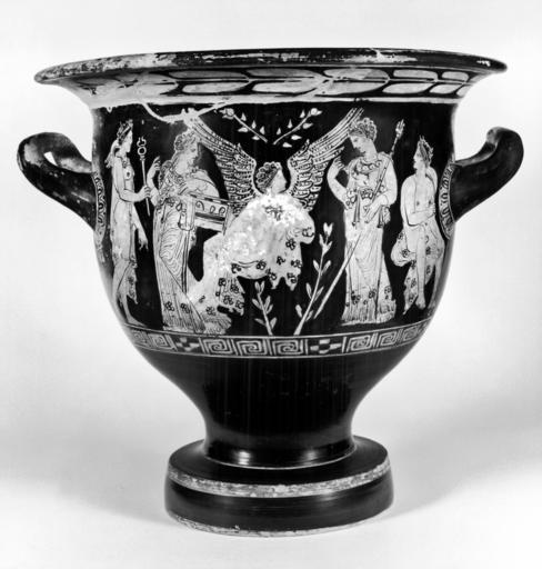 | Keywords: Painter of Vienna 1089 - Red-Figure Bell Krater - Walters 4873 - Side A.jpg The light subject matter languid conventional poses and gestures and decorative detail are characteristic of the transitional period in vase painting A seated Eros in the center is flanked by two goddesses; on the right is probably his mother Aphrodite Hermes stands on the far left Eros's flesh was originally emphasized with white pigment now mostly lost The back shows a scene of youths with their sporting equipment early 4th century BC Classical terracotta cm 37 38 h x diam ; at handles cm 39 5 w accession number 48 73 23872 Don Marcello Massarenti Collection Rome cat no 171 Henry Walters city Baltimore Walters Art Museum Henry Walters Acquired by Henry Walters with the Massarenti Collection 1902 From Alexander to Cleopatra Greek Art of the Hellenistic Age The Walters Art Gallery Baltimore 1988-1989 Things With Wings Mythological Figures in Ancient Greek Art Ward Museum Salisbury 2009 place of origin Athens Greece Walters Art Museum license Ancient Greek red-figure pottery in the Walters Art Museum Painter of Vienna 1089 Media contributed by the Walters Art Museum needs category review Eros in ancient Greek pottery Hermes in ancient Greek pottery |