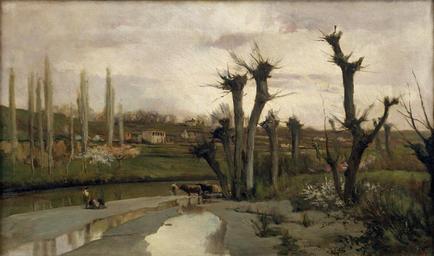 Keywords: painting art artistic artistry oil on canvas landscape sky clouds river stream water trees country countryside nature outside people cattle rural