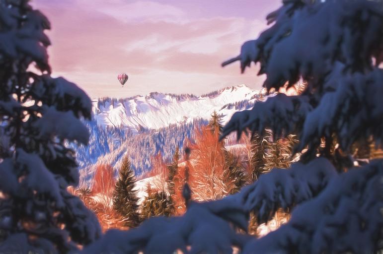 Keywords: painting image painted landscape outlook mountains winter beautiful day hot air balloon art artists