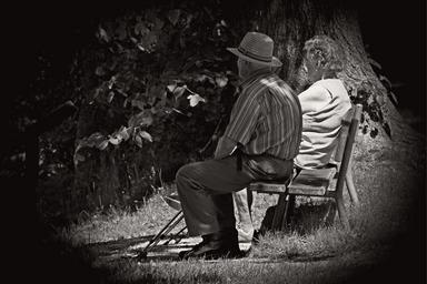 Keywords: pair man woman old age black white together sit rest recovery