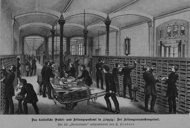 | Keywords: Paket- und Zeitunspostamt Leipzig Zeitungssortiersaal (Die Gartenlaube (1881), S. 413).jpg de Das kaiserliche Paket- und Zeitungspostamt in Leipzig am Johannisplatz / Prager Straße 4-10 Höhe Grassimuseum eröffnet am 16 Oktober 1880 Innenansicht Zeitungssortiersaal Zeitungsverpackungssaal im Erdgeschoss des Hauptgebäudes Stich von Hermann Heubner in Die Gartenlaube 1881 S 413 1881 Die Gartenlaube 1881 S 411-413 Hermann Heubner other versions PD-old-70-1923 Hermann Heubner Johannisplatz Leipzig Paket- und Zeitungspostamt Leipzig Johannisplatz/Prager Straße |