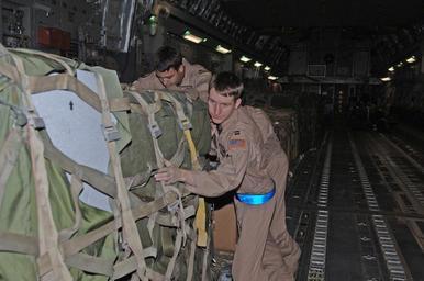| Keywords: Pakistani Earthquake Relief DVIDS10873.jpg en ISLAMABAD Pakistan - Capt Todd Stinchfield C-17 aircraft commander helps unload a pallet of the first relief supplies from the United States here less than 48 hours after the devastating earthquake that left thousands dead and thousands more injured The C-17 and its crew from the 7th Airlift Squadron McChord Air Force Base Wash delivered 12 pallets -- weighing almost 90 000 pounds -- of food water medicine and blankets from Bagram Air Field Afghanistan Two aerial port specialists from Bagram's 455th Expeditionary Logistics Readiness Squadron were also on the flight to coordinate and manage cargo at Islamabad Airmen and soldiers at Bagram with only a few hours notice worked feverishly to palletize the supplies and prepare them for the flight U S Air Force photo by Capt James H Cunningham 2005-10-11 https //www dvidshub net/image/10873 10873 2005-10-11 13 18 PD-USGov McChord Air Force Base Bagram Air Base Images from DoD uploaded by Fæ |