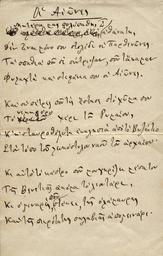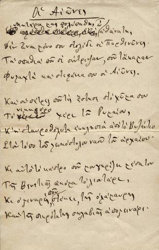 Keywords: Palamas-hoi-aiones.jpg en The handrwritten three first stanzas of the poem Hoi aiones written by the Greek poet Kostis Palamas 1859-1943 el Χειρόγραφο με τις τρεις ρώτες στροφές του οιήματος «Οἱ αἰῶνες» του Έλληνα οιητή Κωστή Παλαμά 1859-1943 First published in 1896 in the Athenian newspaper To Asty www vergosauctions com Kostis Palamas 1859-1943 other versions PD-old-70-1923 Kostis Palamas |