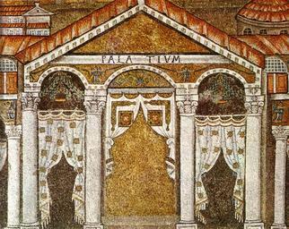 | Keywords: Palatium di Teodorico.jpg Basilica of Sant'Apollinare Nuovo in Ravenna Italy The Palace of Theodoric Mosaic of a Ravennate italian-byzantine workshop completed within 526 AD by the so-called Master of Sant'Apollinare After the defeat of Theodoric the wall mosaics in the Palace and Cathedral were redone by the Byzantines to remove Gothic features The figures in this mosaic were replaced by curtains presumably due to lack of time Several remnants of the earlier work are visible such as a portion of an arm on the third pillar from the left Basilica di Sant'Apollinare Nuovo a Ravenna Il palazzo di Teodorico Mosaico di scuola ravennate italo-bizantina completato entro il 526 d C dal cosiddetto maestro di Sant'Apollinare Dopo la sconfitta del re goto Teodorico i mosaici murali del suo palazzo e questi della cattedrale furono rifatti dai bizantini per cancellare ogni traccia dei precedenti dominatori I dignitari Goti di questo mosaico furono frettolosamente rimpiazzati da tende probabilmente per mancanza di tempo Rimangono diverse tracce del mosaico precedente per esempio un pezzo di un braccio sulla terza colonna da sinistra book G Pischel Storia Universale dell'Arte Vol 1 Mondadori Verona 1966 V-VI century author PD-Art Palace of Theodoric in the mosaics at Sant'Apollinare Nuovo Ravenna |
