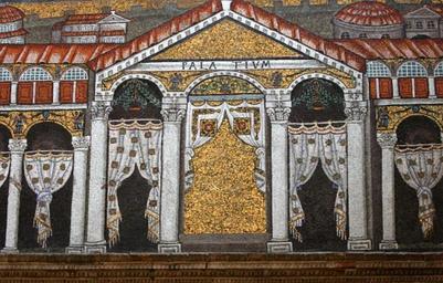 | Keywords: PalatiumTheodoricMosaic.jpg Basilica of Sant'Apollinare Nuovo Ravenna Emilia-Romagna Italy Detail of nave mosaic at the west end depicting Theodoric's Palace The mosaic dates from around 500 AD under Theodoric but around 560 the mosaic was censored by Catholics because the King and his court were Arians and thus considered heretics Their images were replaced with blank backgrounds and curtains A hand belonging to one of the original occupants can still be seen on some columns http //www sacred-destinations com/italy/ravenna-sant-apollinare-nuovo-photos/index htm Sacred Destinations Unknown Roman artisans original mosaic 504 modified around 560 44 4167 12 2046 PD-old-100 Palace of Theodoric in the mosaics at Sant'Apollinare Nuovo Ravenna |