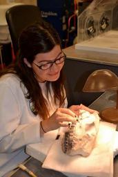 | Keywords: paleontology labwork geology indoor Guest Scientist, Alaina Fike, is in the Paleo Prep lab at Badlands National Park, South Dakota, and shows a Hyracodon skull being prepped using hand tools. (NPS Photo by Alaina Fike, GIP) Guest Scientist, Alaina Fike, is in the Paleo Prep lab at Badlands National Park, South Dakota, and shows a Hyracodon skull being prepped using hand tools. (NPS Photo by Alaina Fike, GIP) | ||||