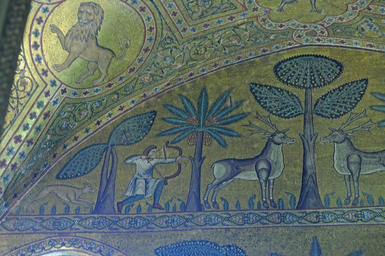 | Keywords: Palermo Palazzo dei Normani Sala dei Ruggero II.jpg author Peacocks at the Fountain of Life 1160-70 object history unknown mosaic Palermo Palazzo dei Normanii Sala di Ruggero II Henry Townsend PD-old-100-1923 henrytow Medieval greyhounds in art Hunting with greyhounds in art 12th-century mosaics in Italy Mosaics in Palermo |
