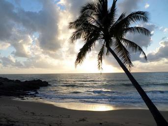Keywords: palm tree tropical beach shore sea ocean sand seascape clouds sky water outdoors cloudy coast peaceful tranquil rocks