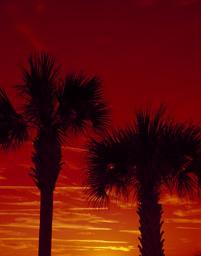 Keywords: palm trees sunset dusk silhouette sky sundown tropical evening sea exotic orange colorful scenic horizon tranquil coast palms