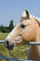 Keywords: palomino horse palomino horse pony equine beautiful portrait close-up profile head photo image outdoors blue sky field pasture animal