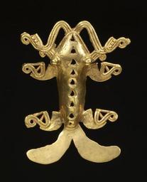 | Keywords: Panamanian - Amphibian Pendant - Walters 57301.jpg This gold pendant combines the characteristics of a frog an iguana a crocodile and a shark The motif seen coming from the creature's mouth is a double-headed crocodile This stylized motif is seen everywhere in Pre-Conquest Panamanian art Smaller crocodile heads sprout from the creature's shoulders to support the double headed crocodiles coming out of the animal's mouth The head appears to be that of a frog with large round eyes that bulge out Along the creature's spine are open designs in the shape of triangles much like spines on the back of an iguana or a crocodile The creature's limbs have stylized crocodile heads at their ends A large fish-like tail protrudes from the creature's end Finally the open mouth seen only in profile displays an impressive set of pointed teeth enlarged versions of crocodile or shark teeth Part of the first group of ancient American gold objects to enter Henry Walters' collection this composite amphibian creature is typical of the Gran Chiriqui style of Panama ca 800 1500 Pre-Colombian gold cm 8 2 accession number 57 301 34003 Tiffany Co New York Henry Walters city Baltimore Walters Art Museum Henry Walters Acquired by Henry Walters 1911 place of origin Veraguas Panama Walters Art Museum license Pre-Columbian gold objects Pre-Columbian art in the Walters Art Museum Jewellery in the Walters Art Museum Pre-Columbian metalwork of Panama Media contributed by the Walters Art Museum needs category review Amphibians in Pre-Columbian art |