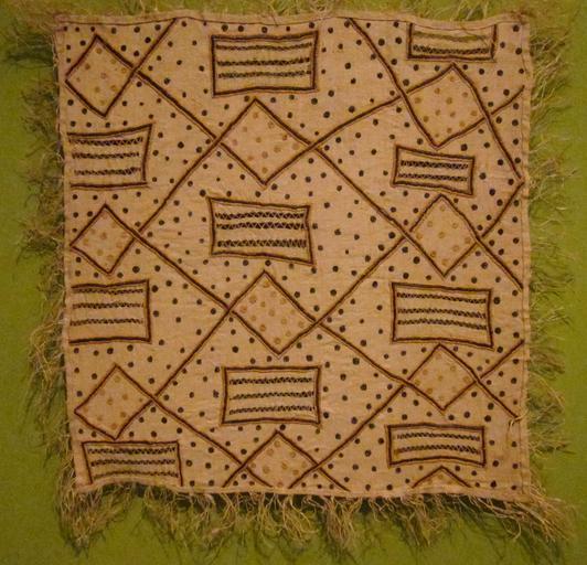 Keywords: Panel, Bushong people, mid-20th century, raffia palm fiber, plain weave, openwork embroidery, and wrapping, HMA.JPG en Panel Democratic Republic of the Congo Bushong people mid-20th century raffia palm fiber plain weave openwork embroidery and wrapping Honolulu Museum of Art own Hiart photo2013 African textiles in the Honolulu Museum of Art Kuba Kuba textiles Cc-zero |