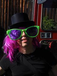 Keywords: panel wig carnival glasses hair perlon pink cylinder hat man person human costume fun