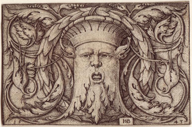 Keywords: Panel with Amascaron2.jpg Creator Sebald Beham Panel with Amascaron 1543 P 235 B 231 2nd state of two Private collection Scan by Nick Michael 2006 Reproduction of 2D artwork in public domain Engravings Green Man 1543 Mascarons Sebald Beham