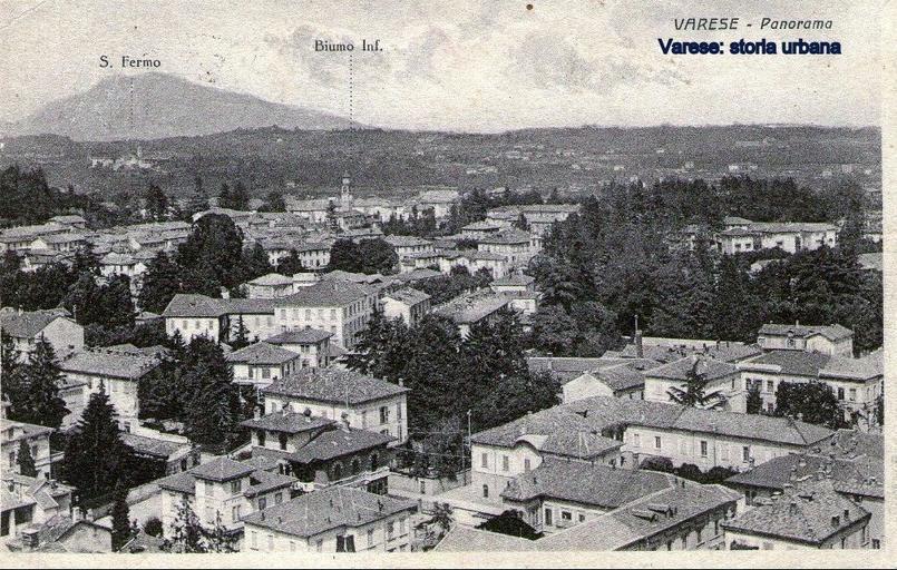 | Keywords: Panorama su Varese e Biumo Inferiore ripreso probabilmente dal campanile di San Vittore. In basso la via Cavour e le vie Rainoldi (a destra) e Bernardino Luini (a sinistra). La villetta in stile eclettico neomedioevale in basso (abbattuta negli anni '60) si trovava all'angolo tra via Cavour e largo Resistenza. varese |