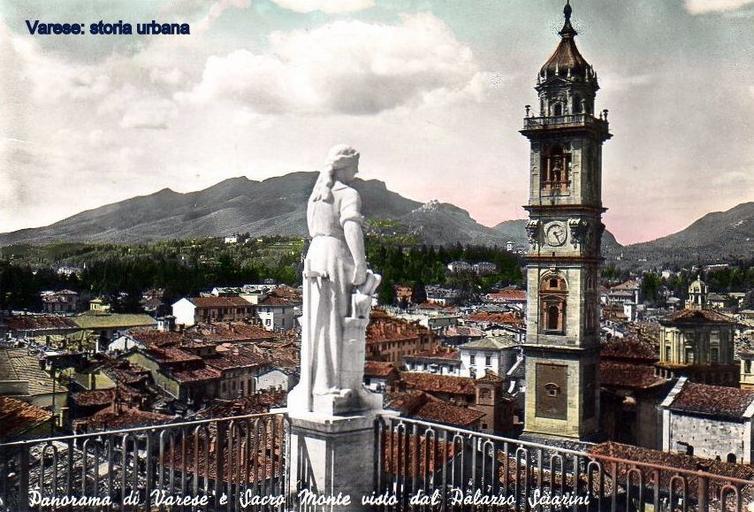 | Keywords: Versione colorata. Vista del centro di Varese, con la piazza San Vittore antecedente alla costruzione del palazzo della Cariplo (ing. Angiolini, 1937), ripresa da palazzo Sciarini (arch. Aldo Scala e ing. Antonino Mazzoni, 1930-33). Sullo sfondo il colle Miogni con villa Mylius e, in secondo piano Sacro Monte e Campo dei Fiori.