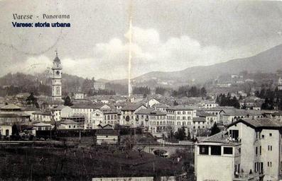 | Keywords: Immagine ripresa da Giubiano. Al centro il binario terminale, occupato da un lungo treno, della stazione delle Ferrovie dello Stato. Dietro palazzi della via Morosini ancora in costruzione, all'estrema destra l'inconfondibile cupola del Politeama. A destra del campanile di San Vittore, sul colle Campigli, la sagoma solitaria ed imponente di villa Molinari-Craven-Seyssel d'Aix (arch. Giuseppe Antonio Bianchi, seconda metà del XVIII sec.), oggi la vegetazione inibisce completamente la visione dell'edificio. varese |